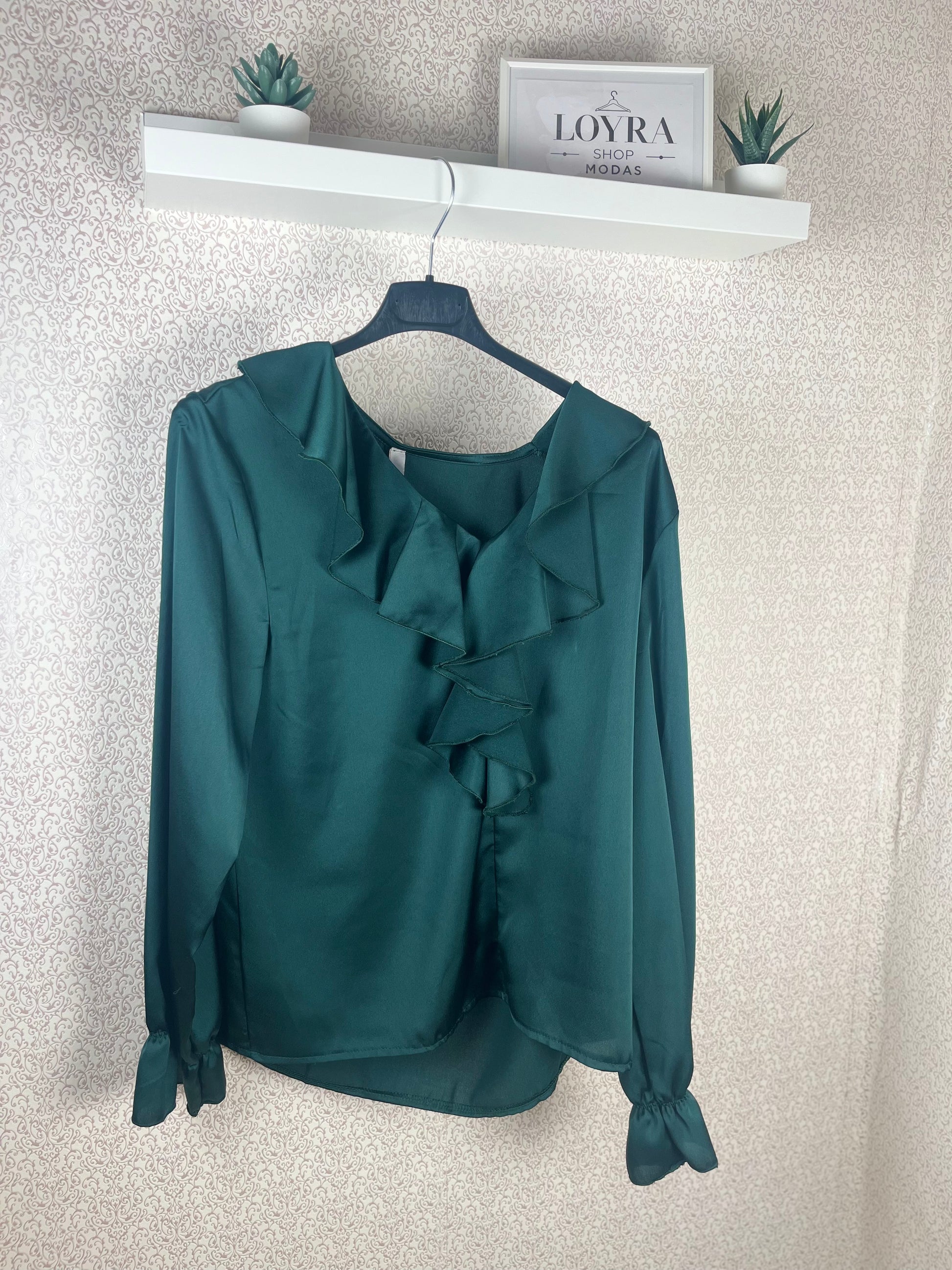 Elegante y femenina blusa de satén en tono verde botella, con detalle de volantes en el escote y puños fruncidos. Tejido suave, con un acabado satinado que aporta un toque sofisticado. Perfecta para combinar con jeans o pantalones de vestir.
