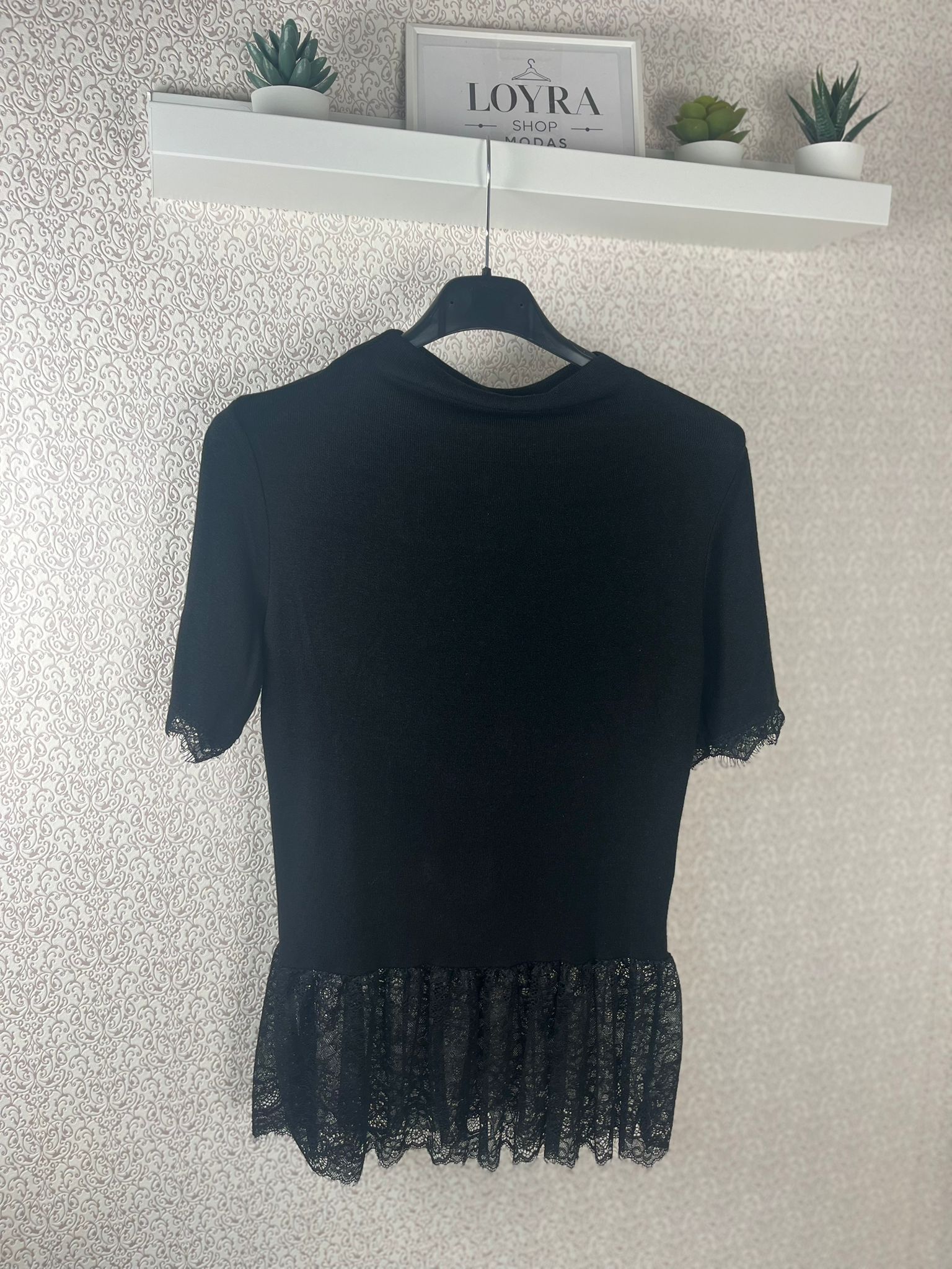 Descubre nuestra camiseta negra con volante de encaje, una pieza que combina la versatilidad del negro con detalles románticos y femeninos. El encaje delicado en mangas y bajo transforma el básico tradicional en una prenda especial y sofisticada.