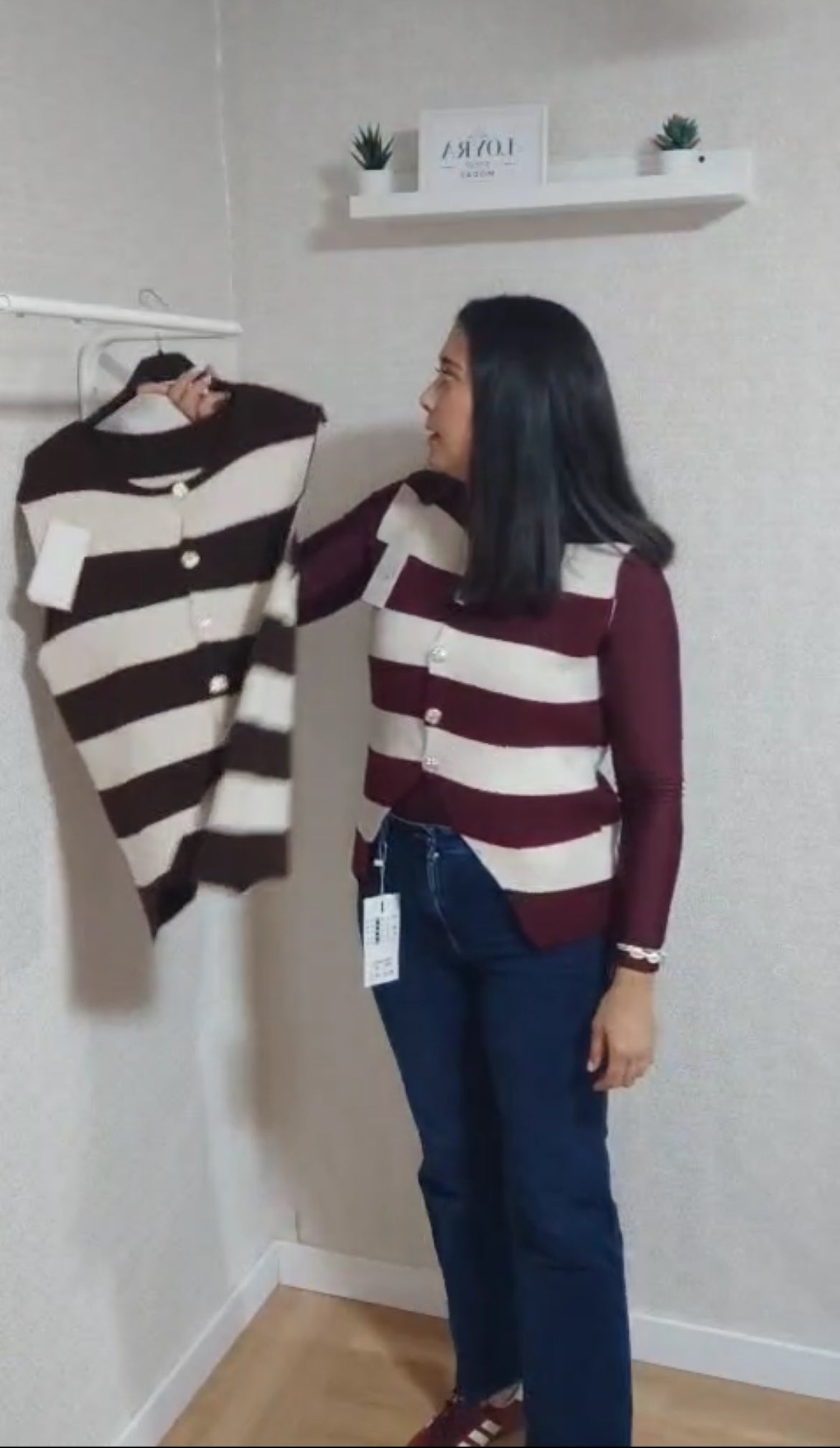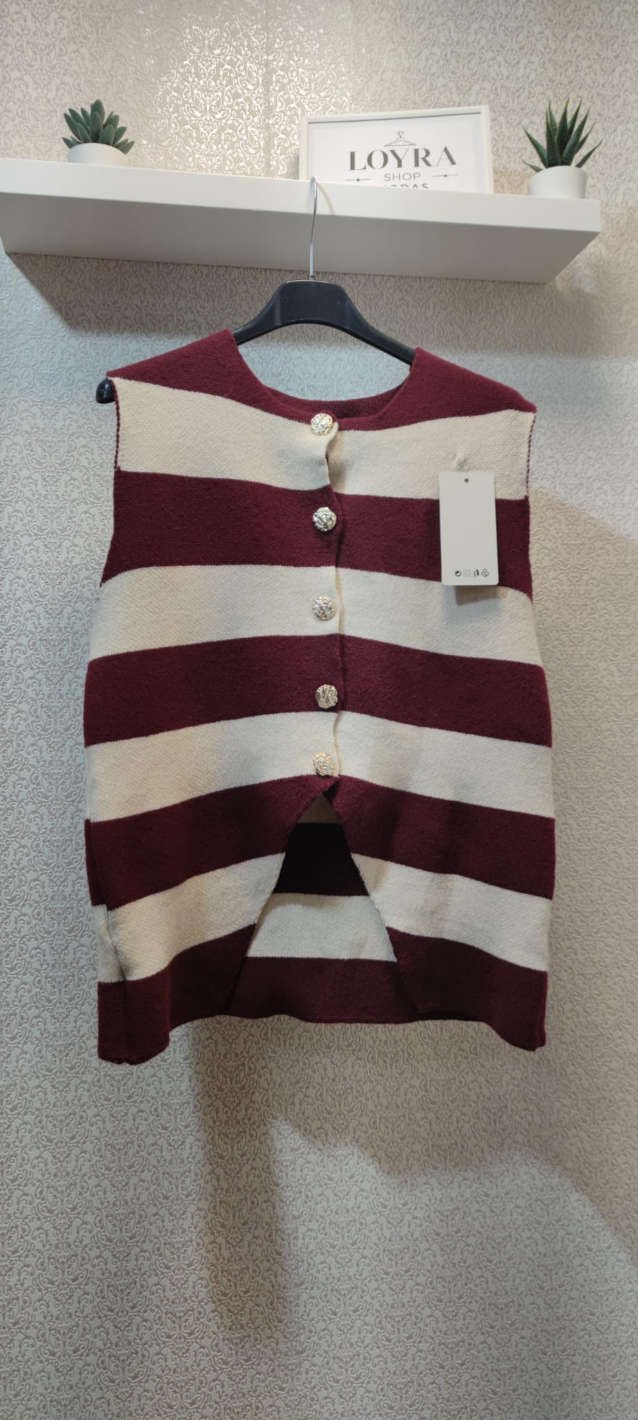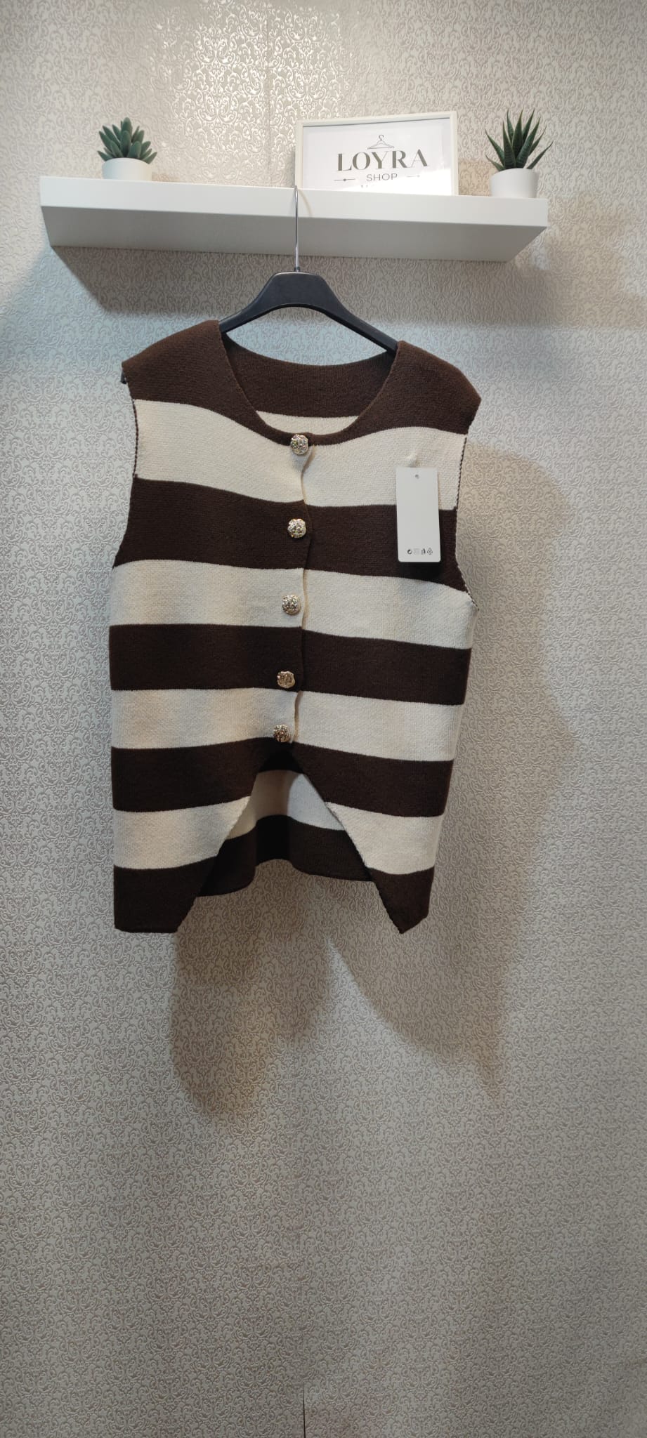 Aporta estilo y calidez a tus looks con este chaleco de punto a rayas, una prenda versátil que combina comodidad con un toque moderno. Ideal para llevar sobre camisas, blusas o camisetas básicas, es el complemento perfecto para tus outfits de entretiempo. Talla Unica