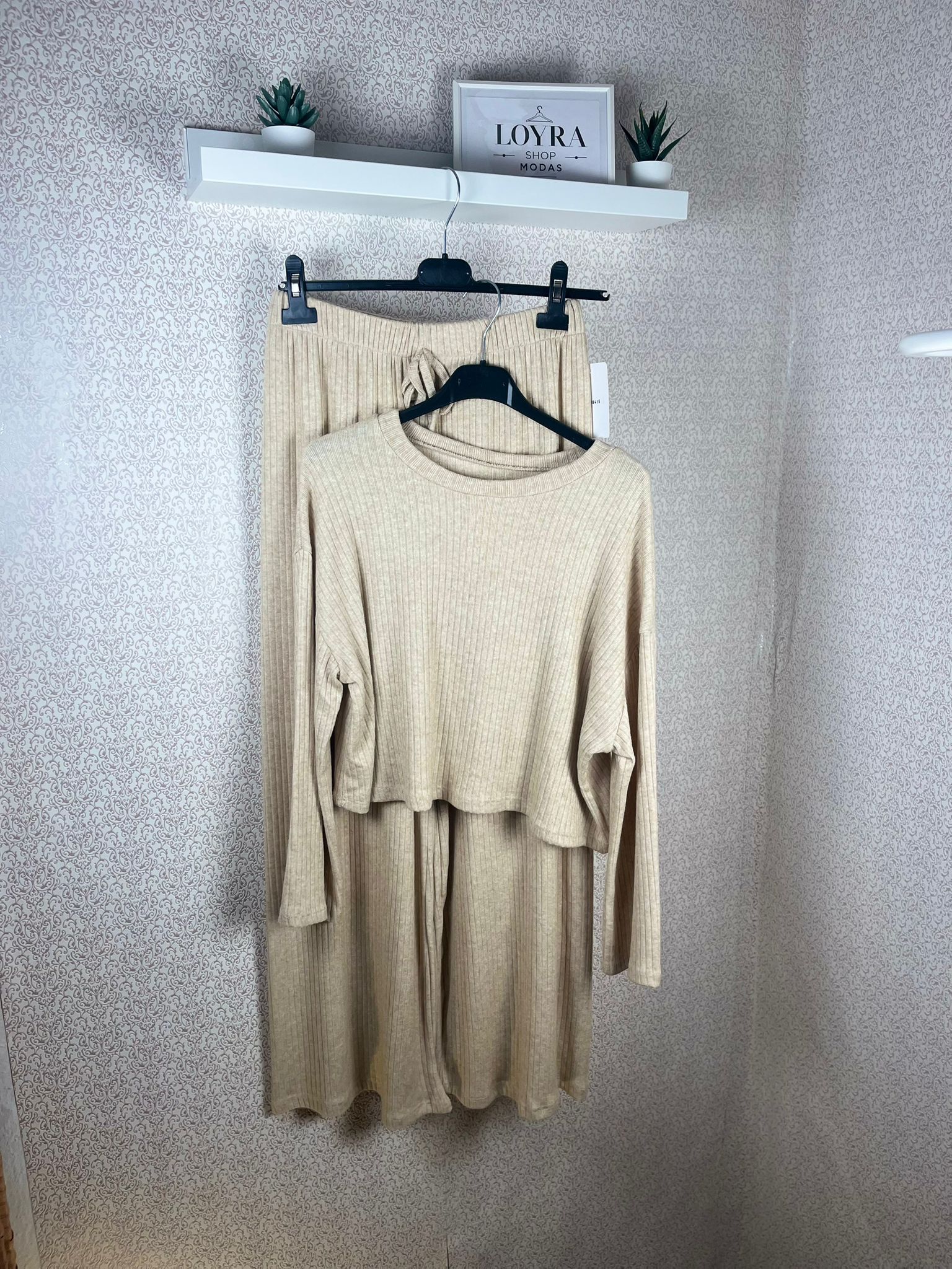 Ideal para looks casuales pero sofisticados. La combinación de punto acanalado en ambas piezas crea una armonía visual perfecta, y el color neutro beige lo hace muy versátil para combinar con diferentes accesorios.