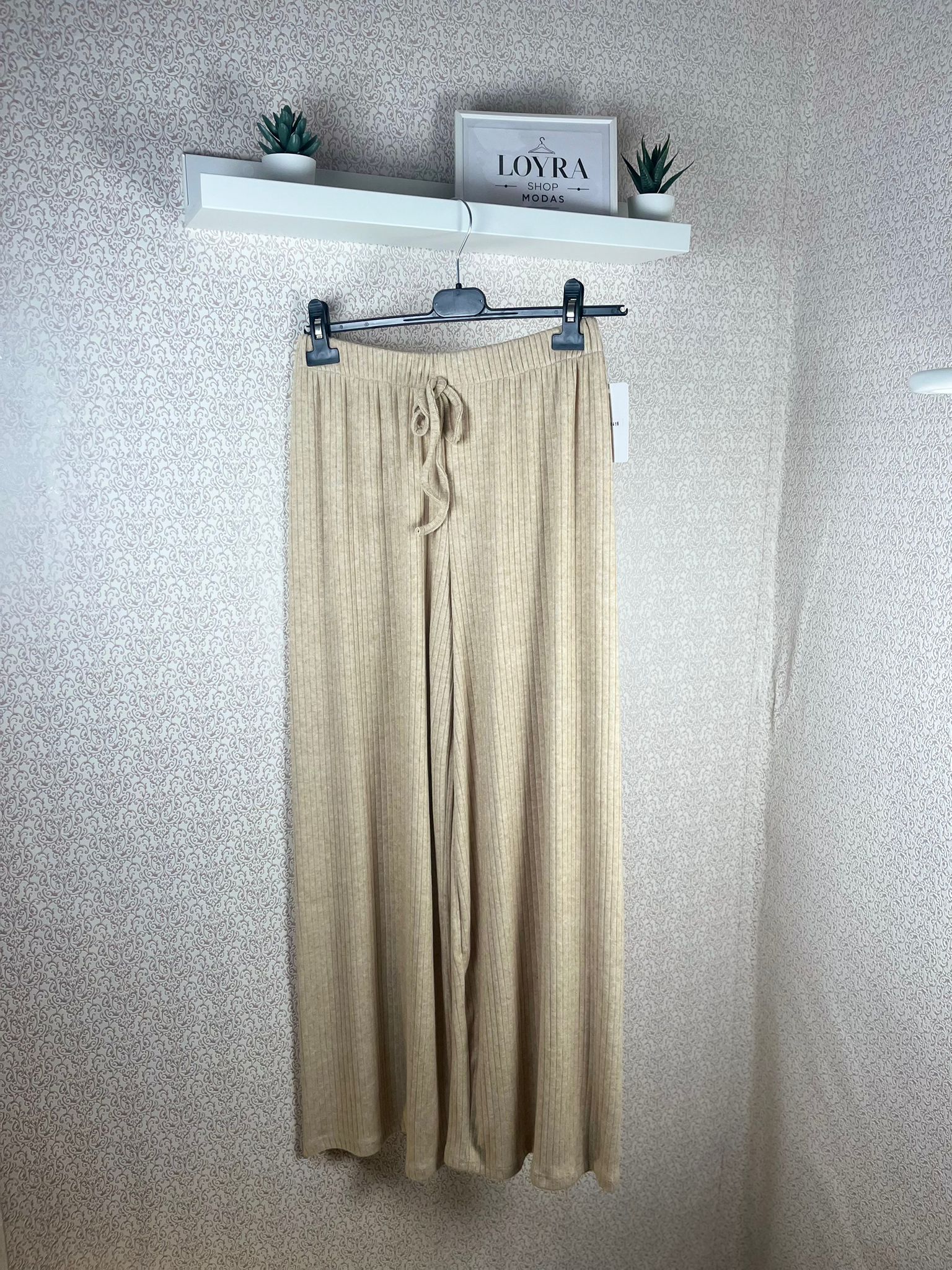 Pantalones anchos de punto acanalado a juego en el mismo tono beige, con textura acanalada que complementa el top, cintura elástica para mayor comodidad y un corte fluido y amplio que cae con elegancia.