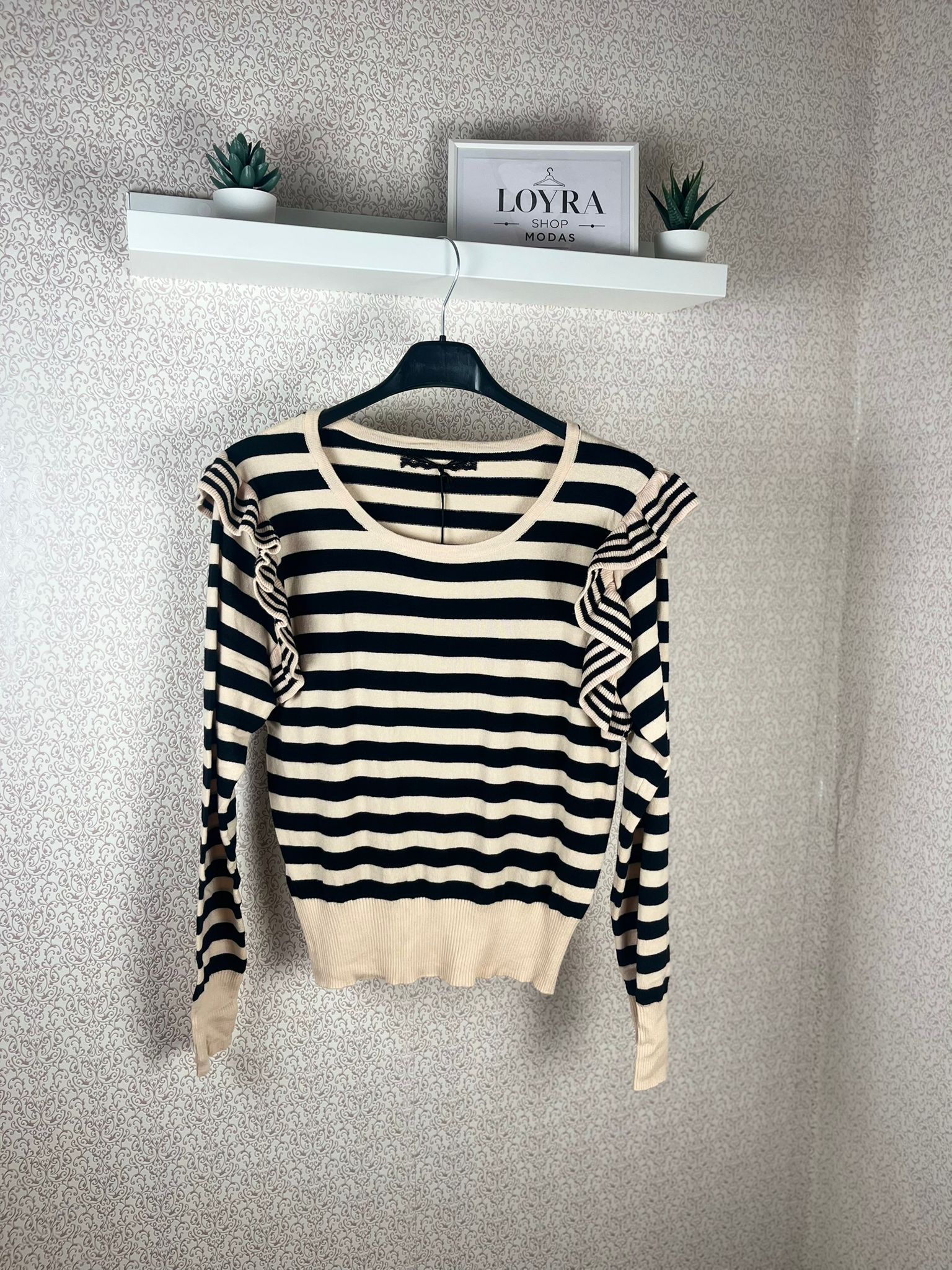 ¡Puro amor por los detalles! Este jersey de rayas beige y negro es ideal para darle un toque chic a tus looks del día a día. Su diseño con volantes en los hombros lo hace súper femenino y moderno, perfecto para destacar sin esfuerzo 😍