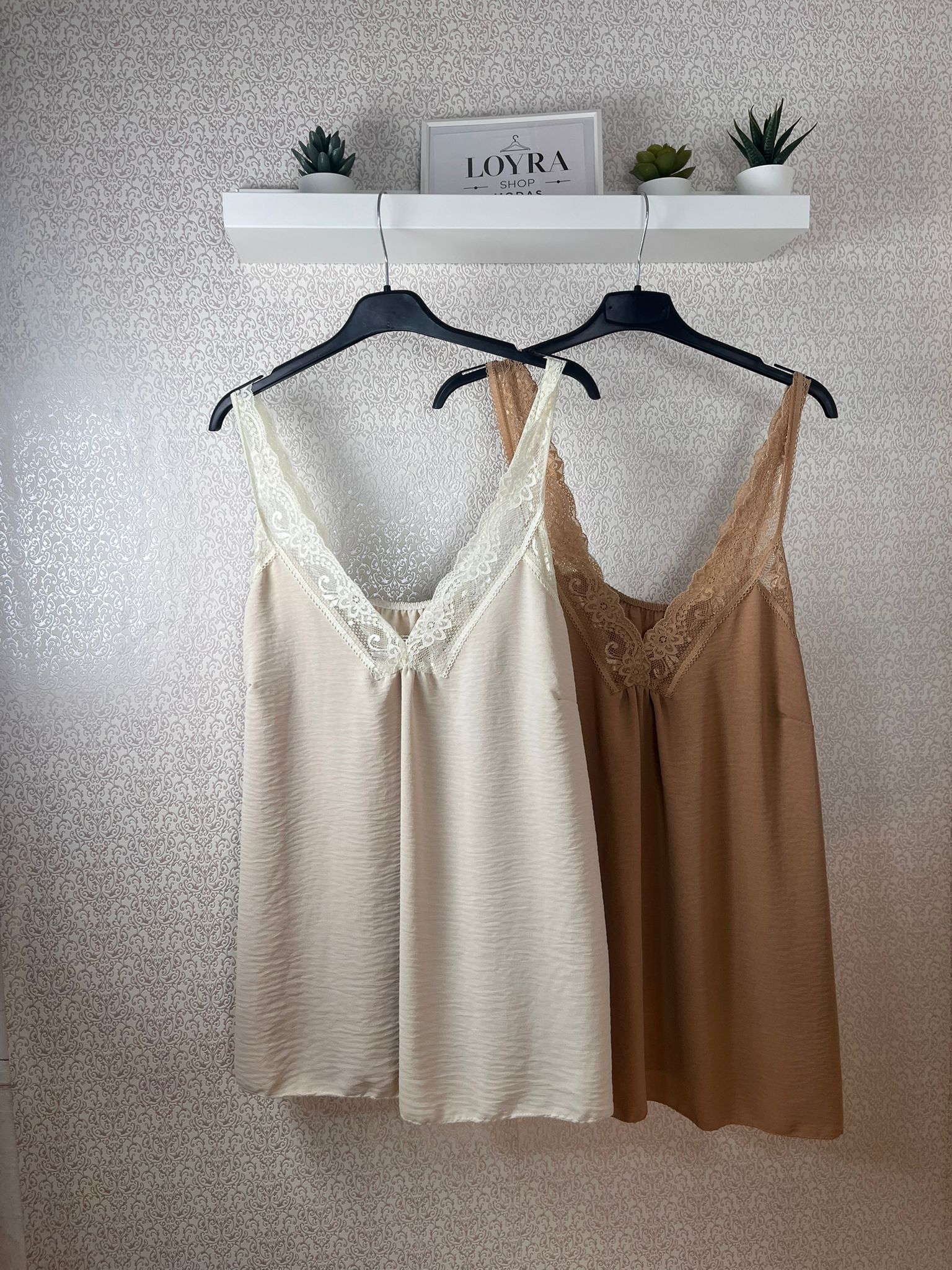 Descubre la sofisticación de nuestra camisola de encaje satinada en tono marfil, una pieza que combina feminidad y confort en cada detalle. Confeccionada en tejido satinado de alta calidad con textura suave al tacto, esta camisola es perfecta para quienes buscan lencería elegante o piezas de descanso con estilo.
